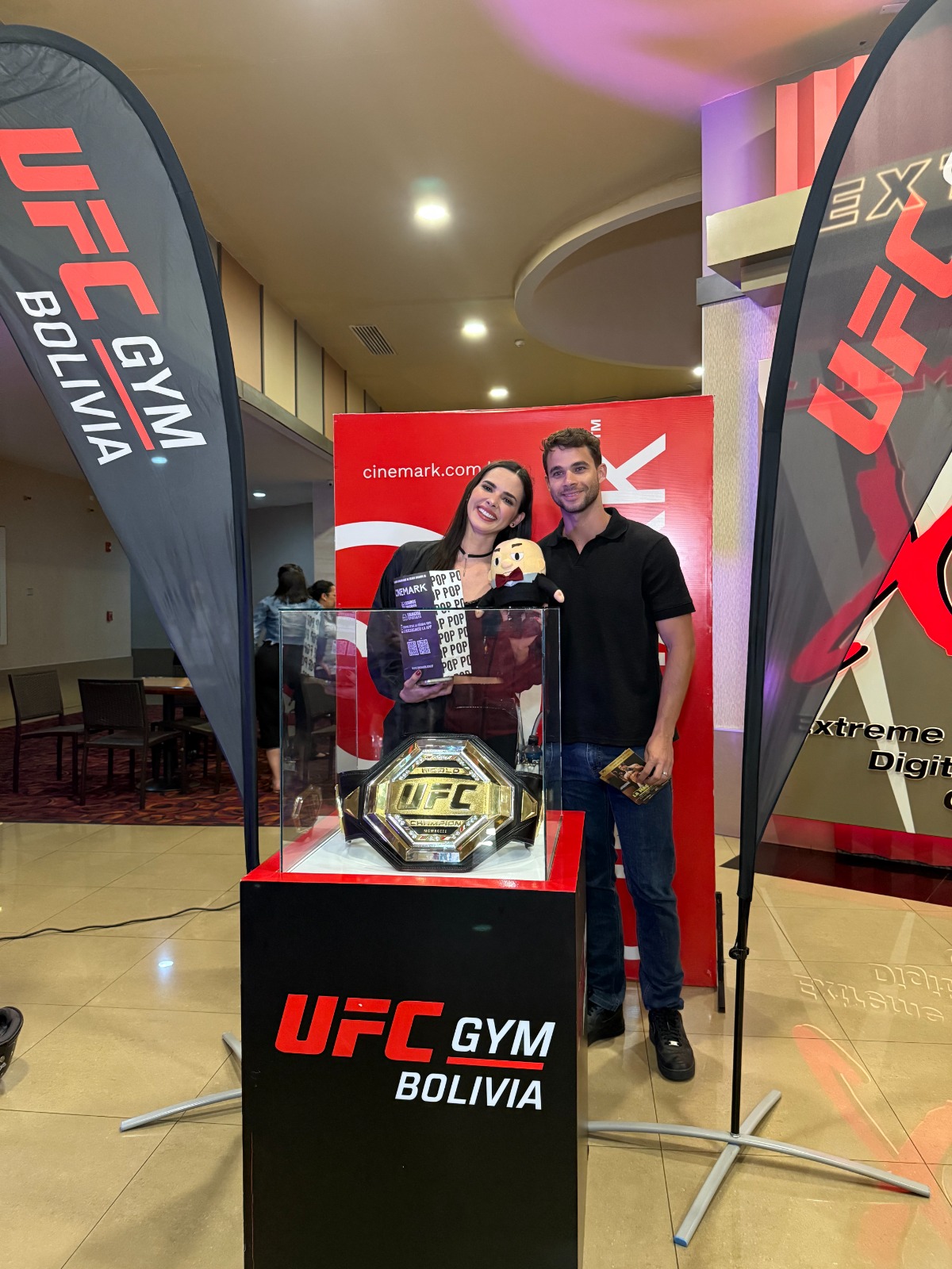 Invitados especiales, creadores de contenido y aficionados a las artes marciales mixtas se reunieron en Cinemark en una velada que combinó cine y entretenimiento. La experiencia incluyó un ring de lucha y un cinturón en exhibición para fotografías, además de una máquina de boxeo que permitió a los asistentes medir su fuerza antes de ingresar a la sala.