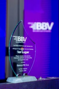 La Paz, 5 de febrero de 2026.- Banco FIE fue reconocido por la Bolsa Boliviana de Valores (BBV), ocupando el “1er lugar” de emisores del Mercado Primario de Renta Fija con un monto colocado de US$ 41.6 millones de dólares, durante la gestión 2025.