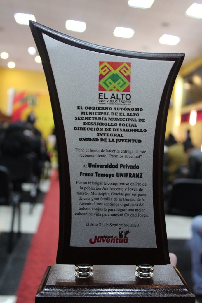 El Alto. Septiembre. Por su compromiso con los adolescentes y jóvenes de la Ciudad de El Alto, UNIFRANZ recibió el “Premio Juventud” de parte de la Secretaría Municipal de Desarrollo Social, la Dirección de Desarrollo Integral y la Unidad de Juventud del Gobierno Autónomo Municipal de El Alto (GAMEA).