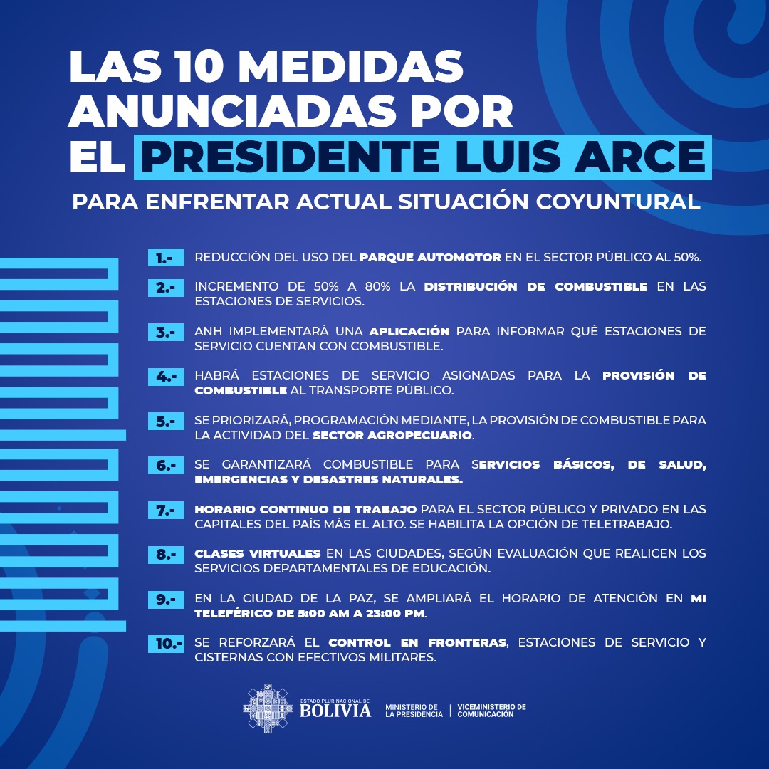 7. Horario continuo de trabajo para el sector público y privado en todas las capitales del país más El Alto. Habilitando también la opción de teletrabajo.