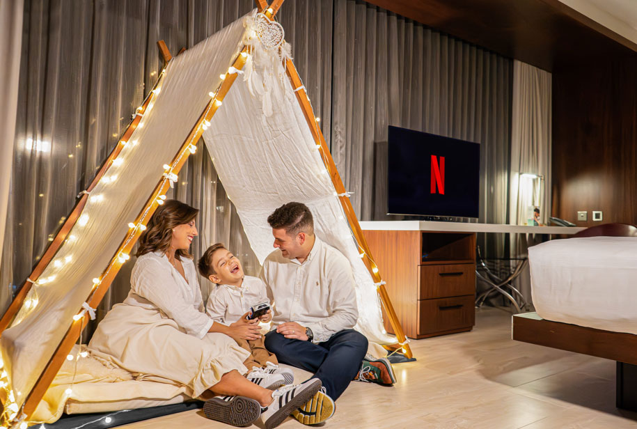 • Familias: Paquetes temáticos como Funtastic Family Night o Movie Night, que convierten la habitación en una experiencia lúdica con decoración, luces, golosinas y actividades pensadas para compartir.