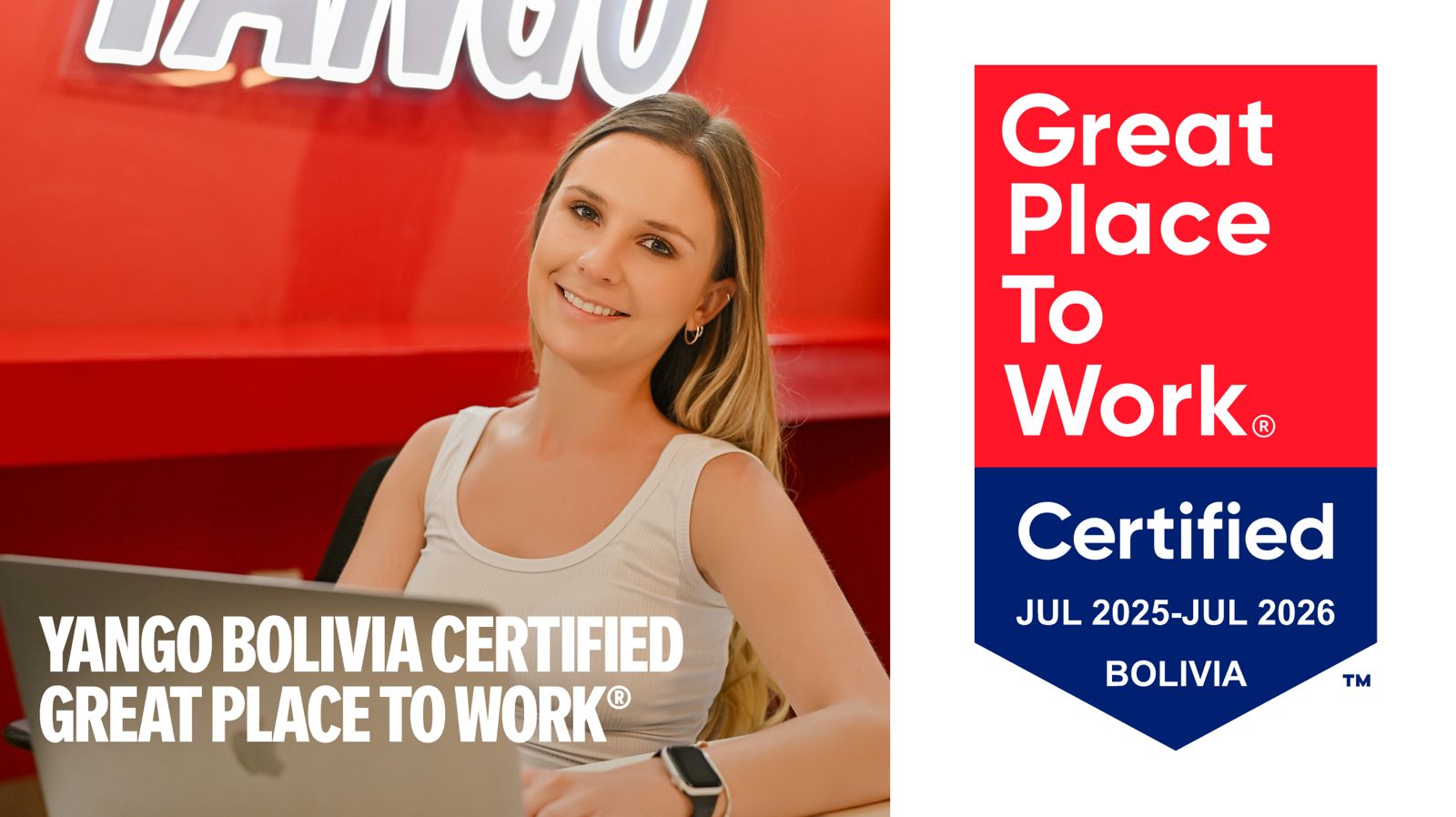 Bolivia, Agosto de 2025.- Yango Bolivia ha sido reconocida oficialmente como un Great Place To Work ® (Excelente Lugar para Trabajar), tras una evaluación basada en comentarios anónimos de sus empleados. Esta certificación destaca la solidez de la cultura organizacional de la empresa en Bolivia y su compromiso con la construcción de un entorno laboral seguro, inclusivo y significativo.